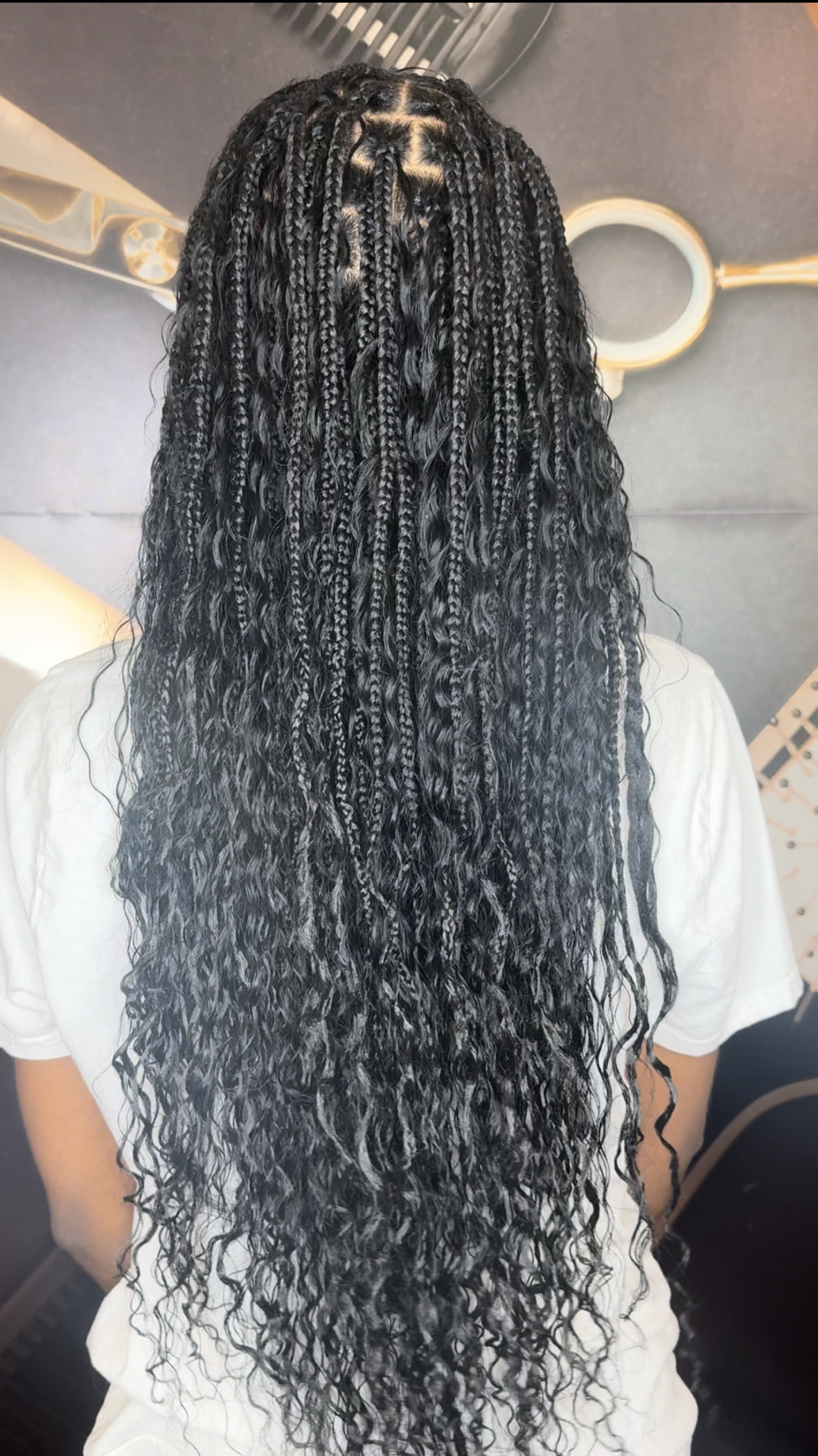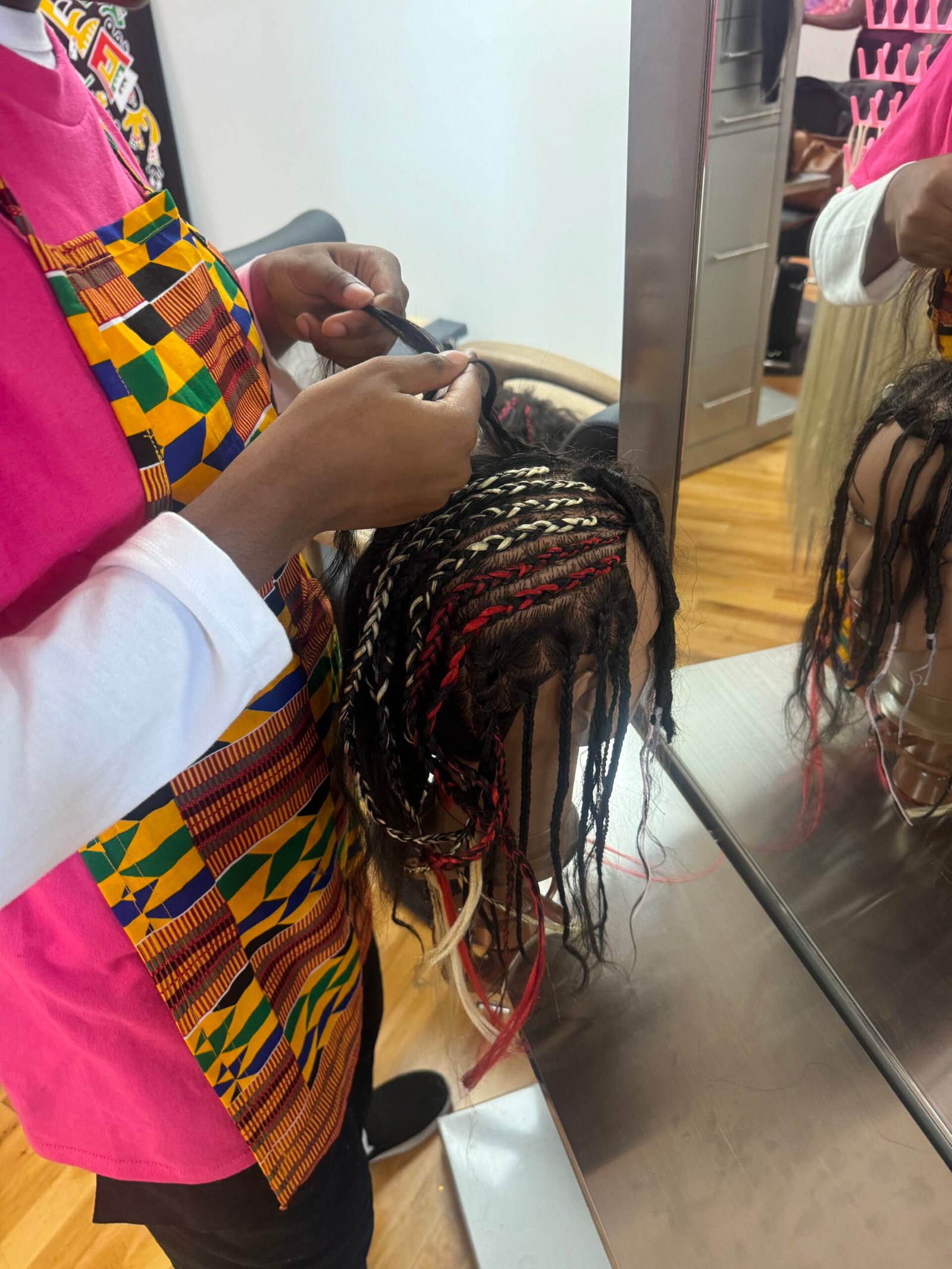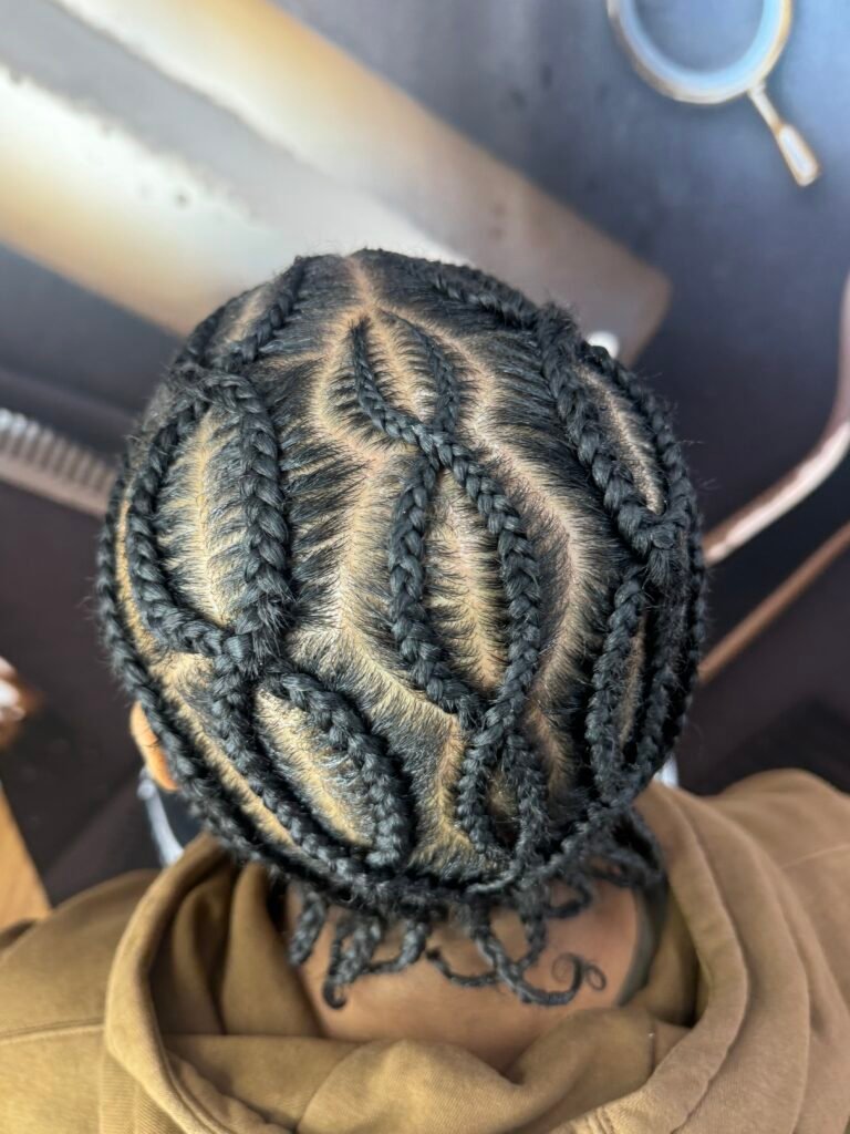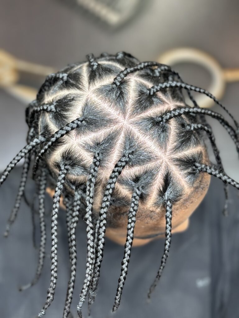 A culturally inspired braiding style featuring intricate patterns and clean parting in the front half, while having knotless braids in the back.