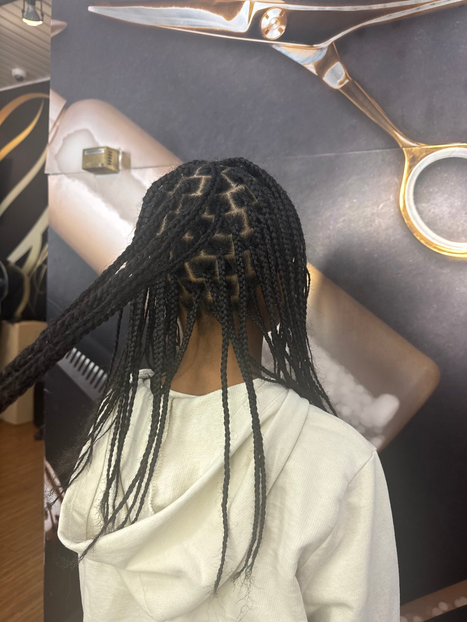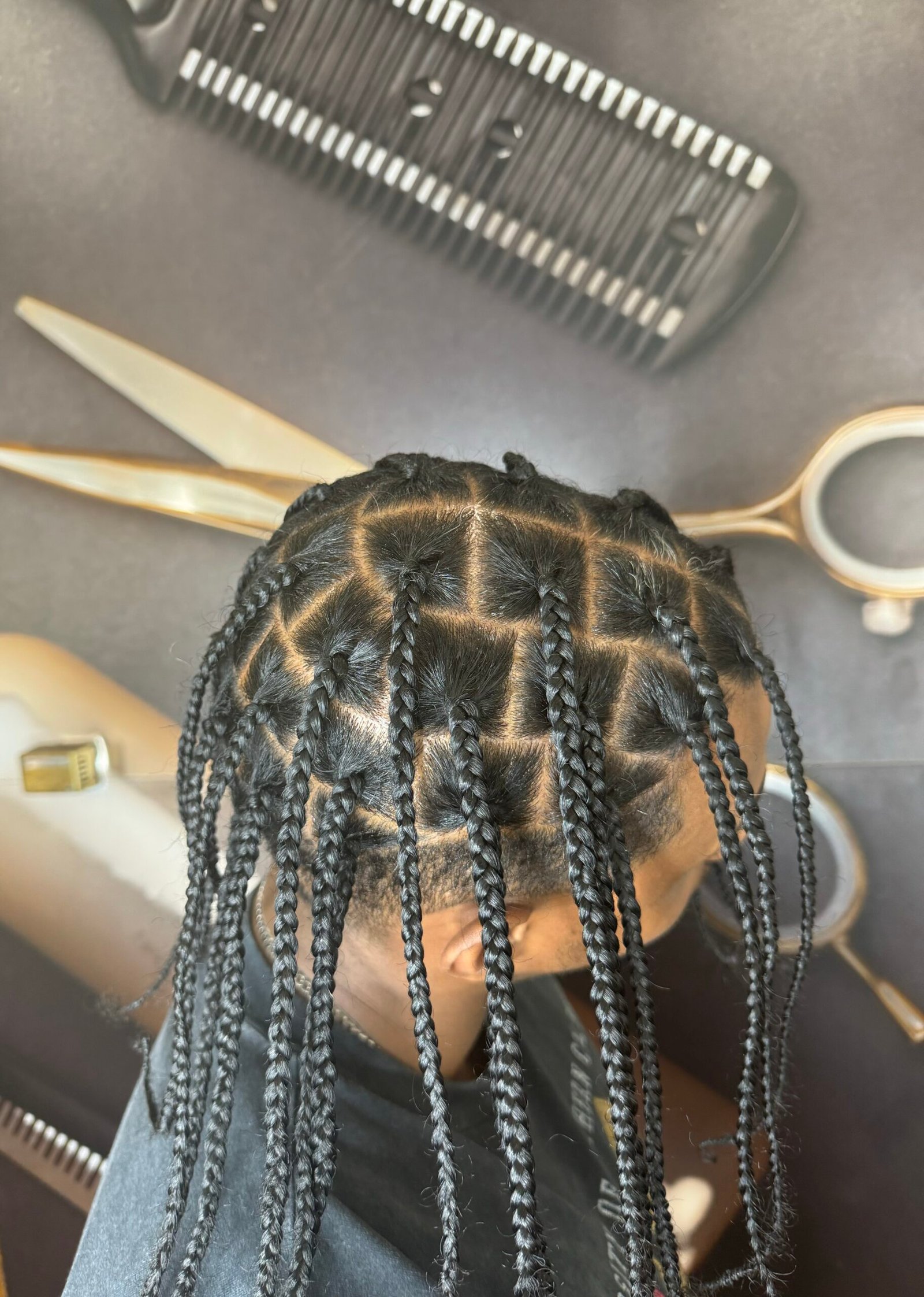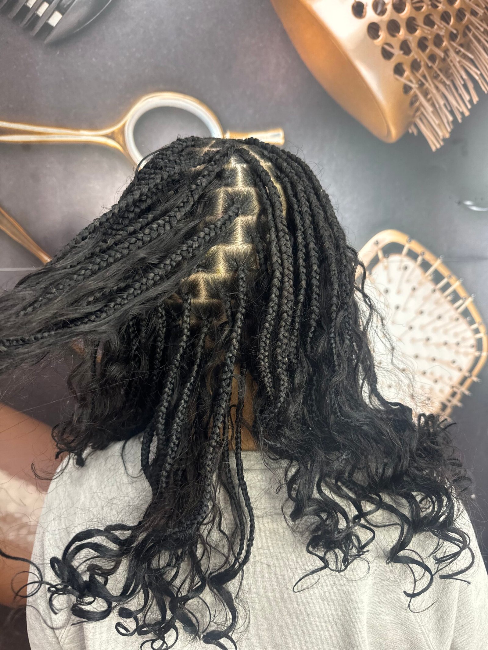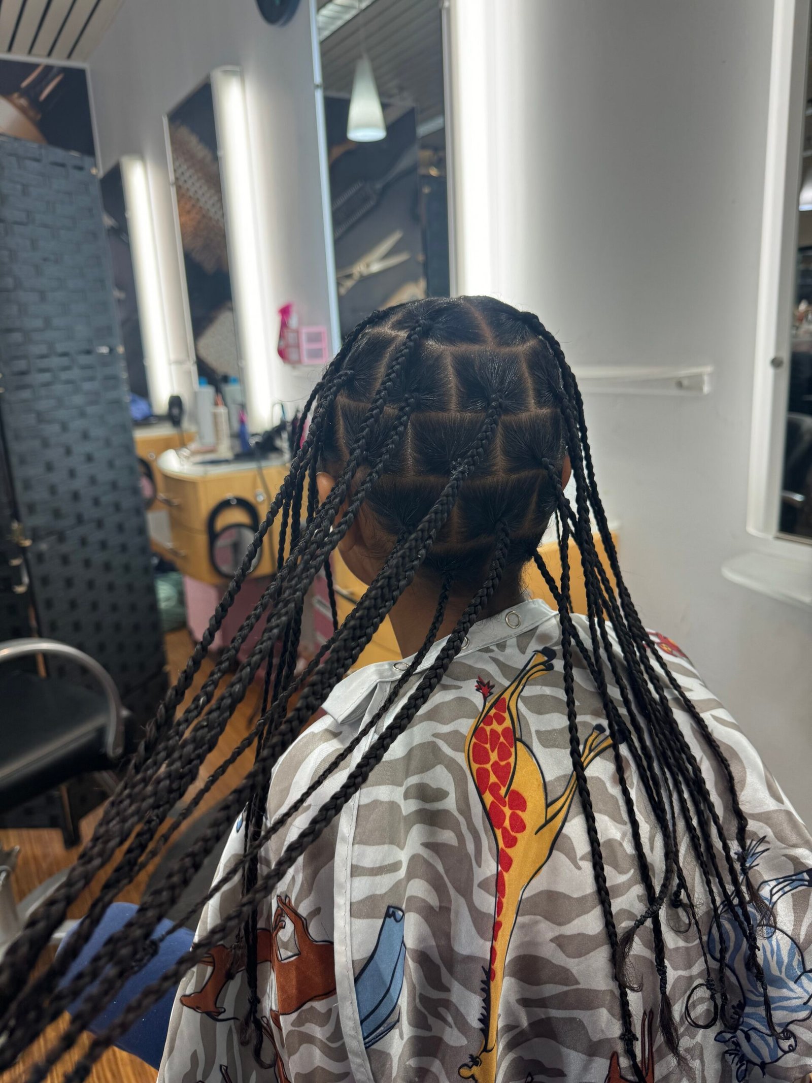 A culturally inspired braiding style featuring intricate patterns and clean parting in the front half, while having knotless braids in the back.